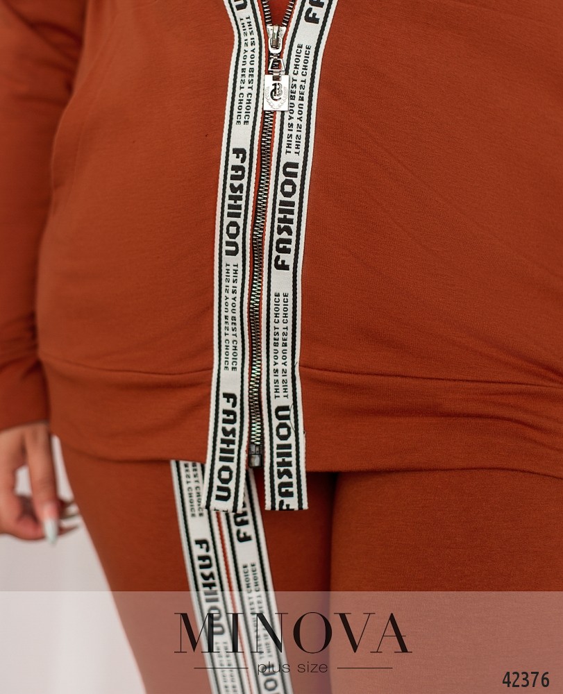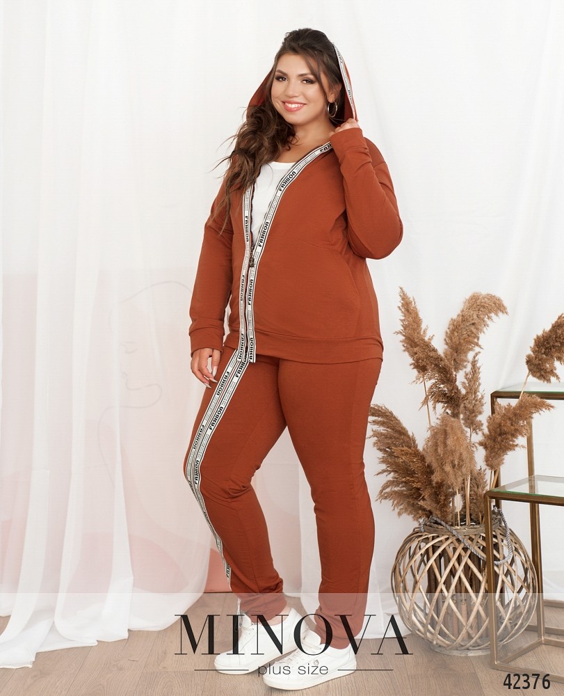 Элегантный спортивный костюм большого размера. Толстовка с накладными карманами по бокам и декоративной планкой-принтом, под ней - рабочая молния, толстовка с капюшоном. Рукава с мягкими манжетами. Брюки с лампасами в тон планке, по бокам - врезные карманы, посадка высокая, в пояс вшита резинка, снизу манжеты.