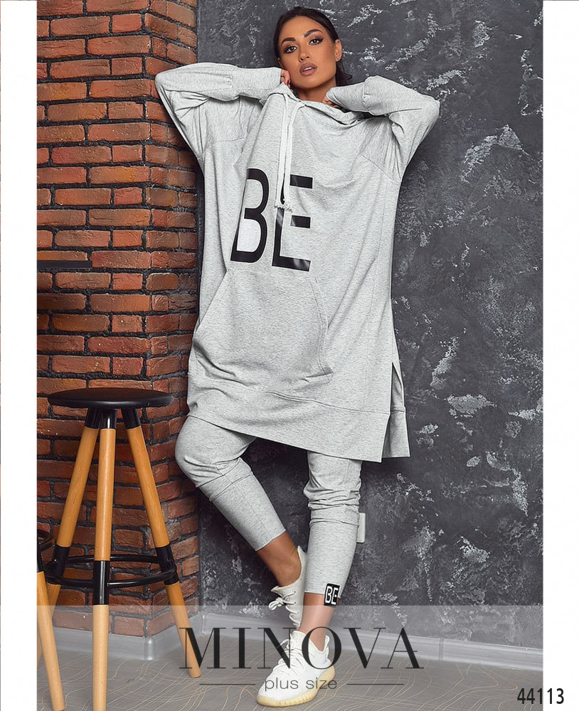 Оригинальный костюм с длинной толстовкой и брюками. Толстовка с капюшоном, через него пропущен шнурок. Рукава с мягкими манжетами, спереди на талии - карман-кенгуру. По бокам - очень длинные разрезы. На груди крупный принт. Брюки с длинными манжетами, на левом манжете декоративная нашивка, в пояс вшита резинка, по бокам - карманы в шве, посадка высокая.