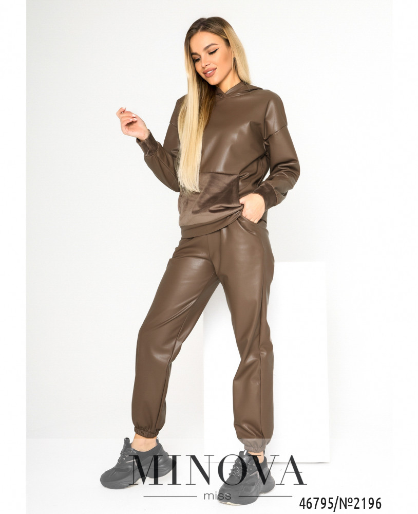 Стильный спортивный костюм, выполненный из эко-кожи, может стать любимой вещью для женщины, ценящей практичность и не забывающей о модных тенденциях. Минималистичные брюки-джогеры с карманами в боковых швах и резинками, вшитыми по линии талии и по низу штанин, дополняет худи в тон с капюшоном, карман-кенгуру и манжеты которого выполнены из мягкого велюра.
