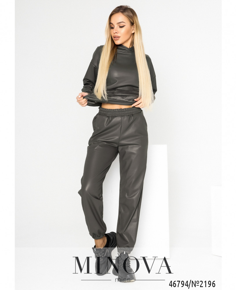 Стильный спортивный костюм, выполненный из эко-кожи, может стать любимой вещью для женщины, ценящей практичность и не забывающей о модных тенденциях. Минималистичные брюки-джогеры с карманами в боковых швах и резинками, вшитыми по линии талии и по низу штанин, дополняет худи в тон с капюшоном, карман-кенгуру и манжеты которого выполнены из мягкого велюра.