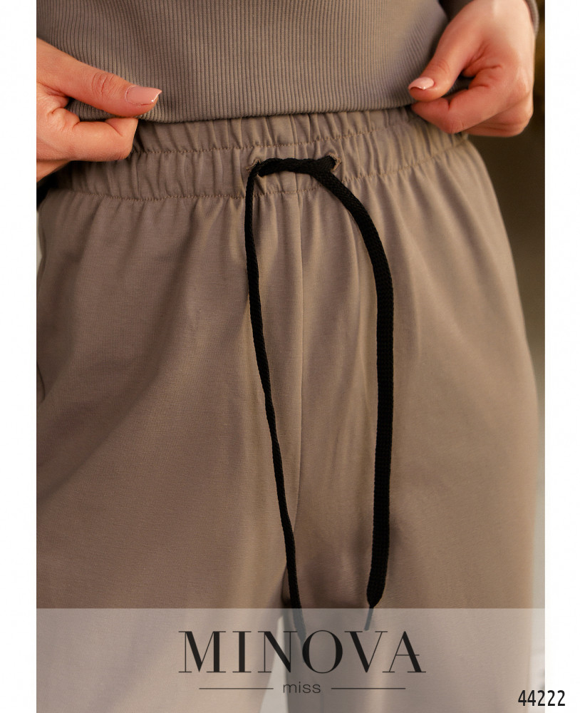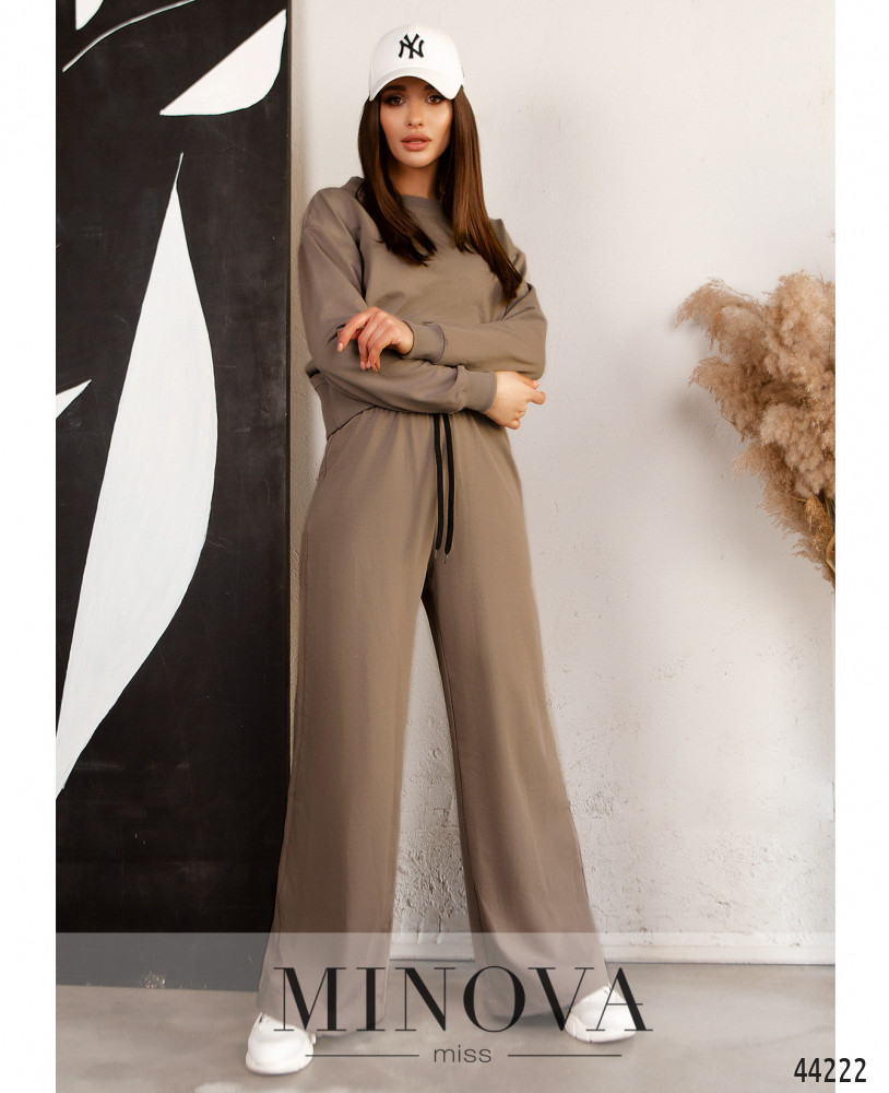 Минималистичный и стильный спортивный костюм со свитшотом и брюками. Брюки без карманов, через пояс пропущен шнурок, брючины свободные, широкие, посадка высокая. Свитшот с мягкими манжетами на подоле, на рукавах и на горловине, рукава свободные, сужаются к манжетам. Линия плеча немного приспущена. Карманов и застёжек нет.
