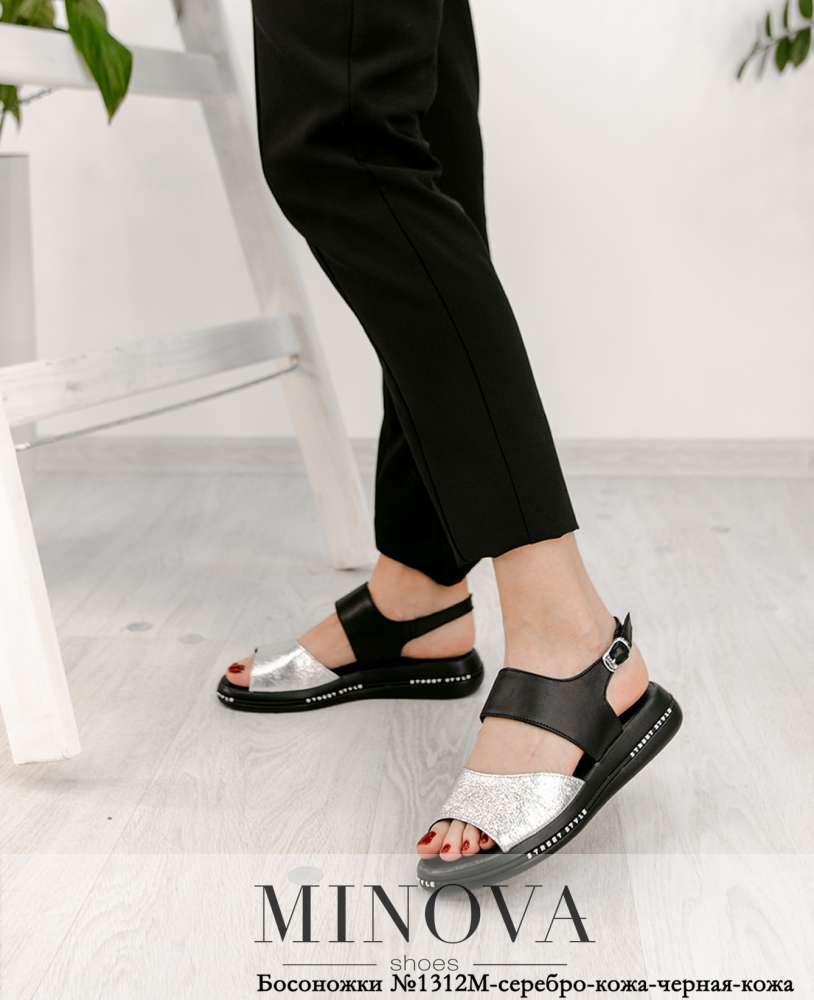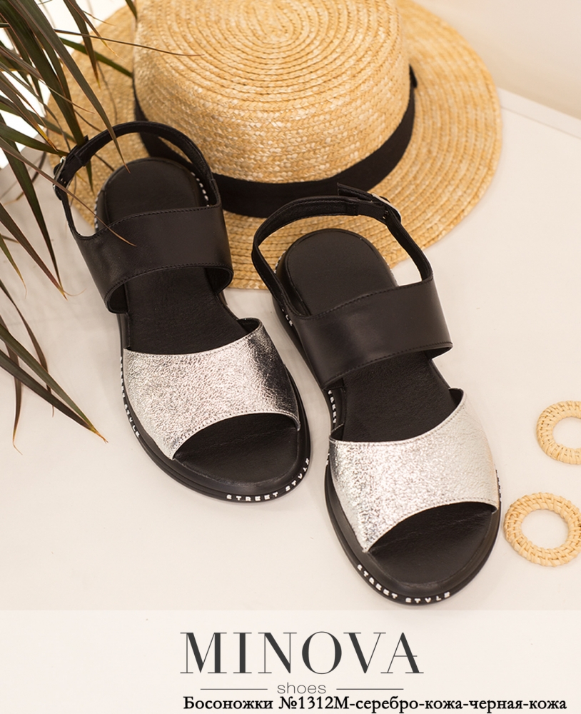Нарядные контрастные кожаные босоножки с открытым носком и задником. Подошва плотная, средней высоты, гибкая, с принтом по канту. Застёжка - на пояске, который охватывает щиколотку.