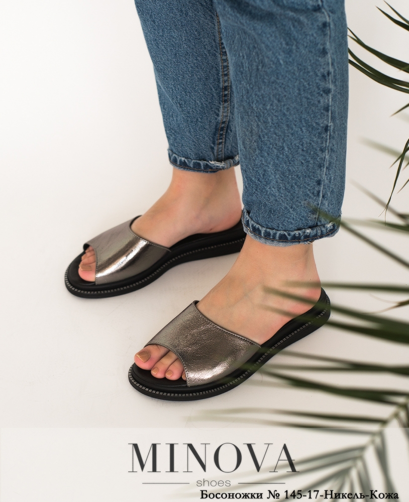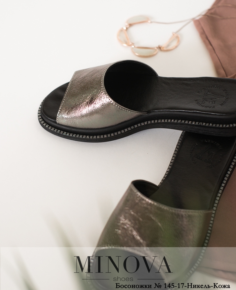 Лёгкие и удобные босоножки из натуральной кожи, без застёжек, подошва украшена металлическим декором по боковой поверхности.