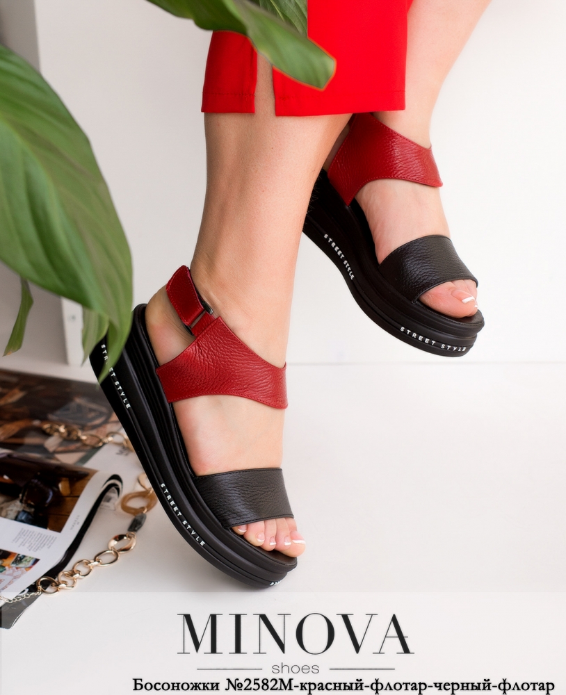 Стильные кожаные сандалии с застёжкой на липучке, расположенной на щиколотке. Носок и пятка открытые. Подошва высокая, плоская, устойчивая, с декоративной надписью и рифлением по боковой поверхности.