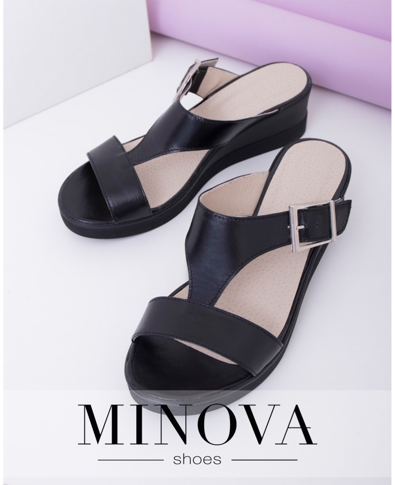Кожаные мюли на танкетке с открытой пяточкой. Мюли состоят из двух сшитых полос и украшены пряжкой. Внутри кожаная стелька.