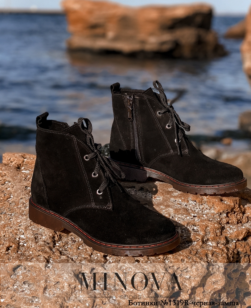 Стильные ботинки с утеплением, изготовлены из натуральной кожи. На подъёме - шнуровка, под ней - язычок. Отверстия шнуровки укреплены люверсами. На внутренней стороне - рабочая молния. На заднем пояске - петелька. Подошва полупрозрачная, гибкая, с поперечным рифлением. Прошита контрастной строчкой.