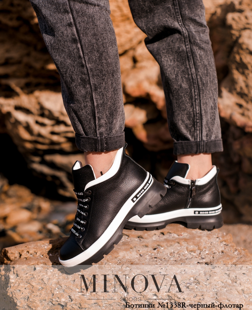 Яркие кожаные ботинки с контрастной окантовкой верха и подошвы, а также с контрастным принтом на шнурках. Шнуровка с укреплёнными отверстиями. Подошва с круглым и поперечным рифлением, на заднем пояске - петелька. На внутренней стороне - рабочая молния. Высота обуви - 9.5 см.