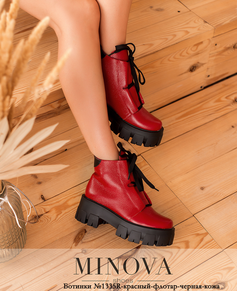 Высокие утеплённые кожаные ботинки со шнуровкой на подъёме, под шнуровкой - язычок, шнурки пропущены через широкие петельки-кулиски. Верх задника - с уплотнённой вставкой. Подошва рельефная, с уплотнёнными каблуком и носком.