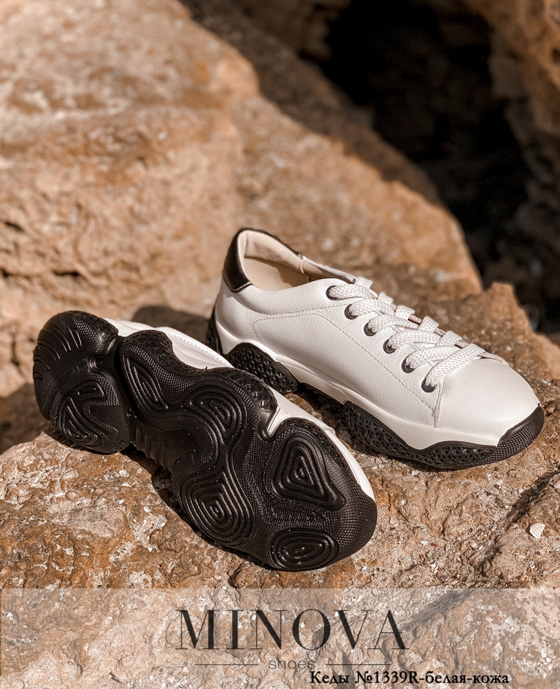 Оригинальные кожаные кеды с контрастной окантовкой задника, язычка и подошвы. Шнуровка с отверстиями, укреплёнными люверсами, под ней - язычок. Подошва с протектором с волнистыми углублениями, окантована декоративными уплотнениями.