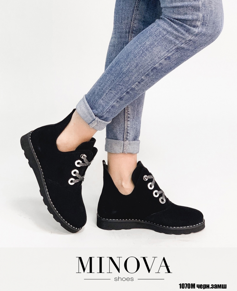 Замшевые ботинки на шнурках с фигурным голенищем. Ботинки на утолщенной рифленой подошве с декоративным блестящим рантом.