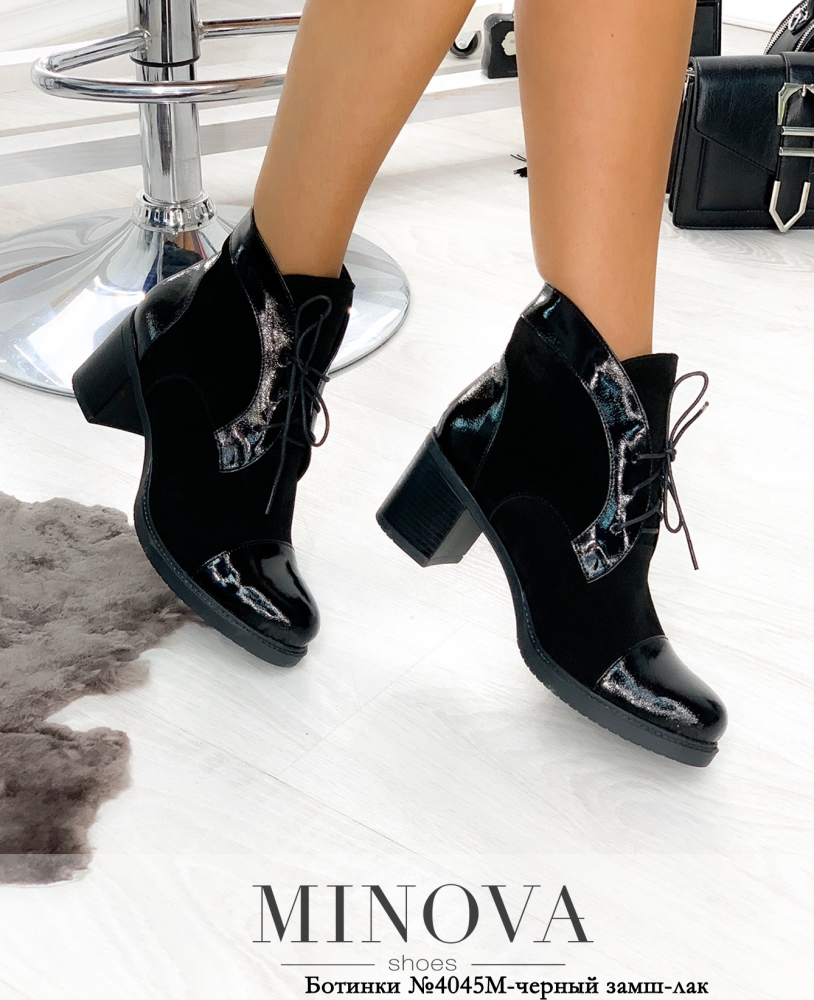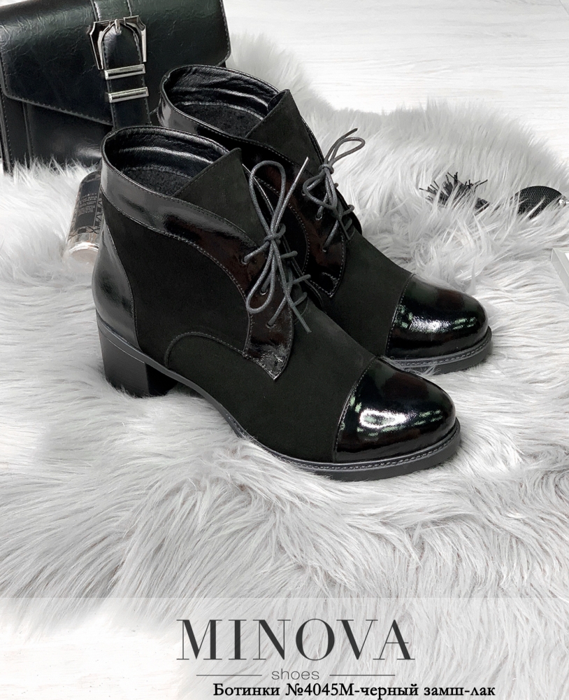 Сочетание нескольких видов натуральной кожи выглядит очень привлекательно и нарядно. Minova представляет в новом каталоге женской обуви ботинки на невысоком устойчивом каблуке, с мелкой ребристостью подошвы. Ботинки с немного скошенным вперёд верхом, отороченным лаковой кожей в большинстве вариантов. Носок и задник также лакированы. Основная часть – из замши или гладкой кожи. Внутри - утепление мягкой цигейкой. Спереди располагается шнуровка с тонкими шнурками без металлических люверсов, под ней - язычок. Такие ботинки прекрасно впишутся в деловой дресс-код, можно выбрать яркий, броский оттенок или благородный тёмный цвет.
