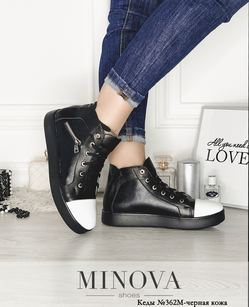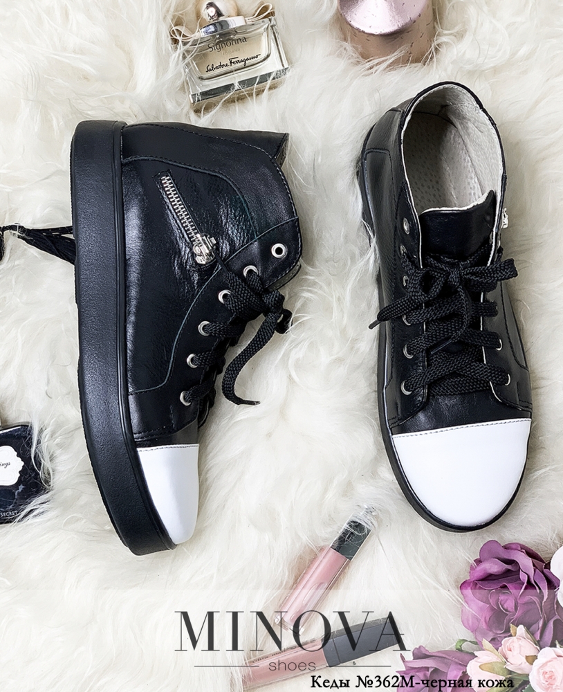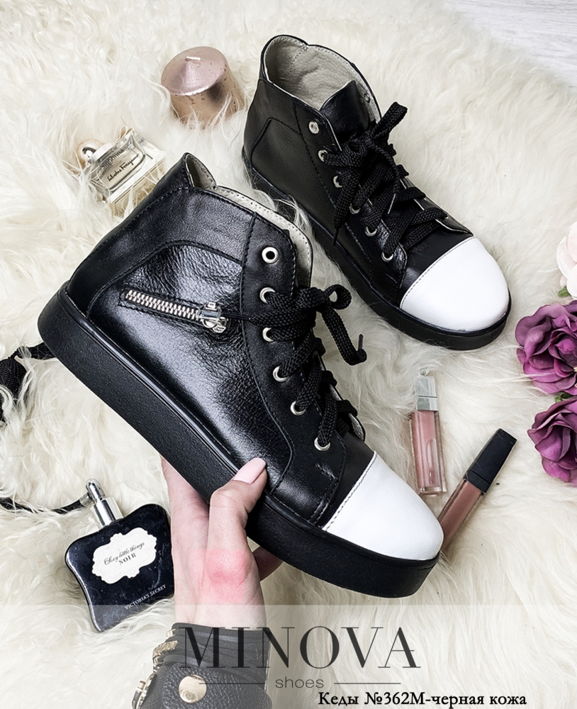 Кожаные кеды на шнурках с высоким голенищем. Носок выделен белой кожей и прострочен по линии шва. По бокам кеды украшены декоративной молнией. Шнурки изготовлены с металлизированной нитью.