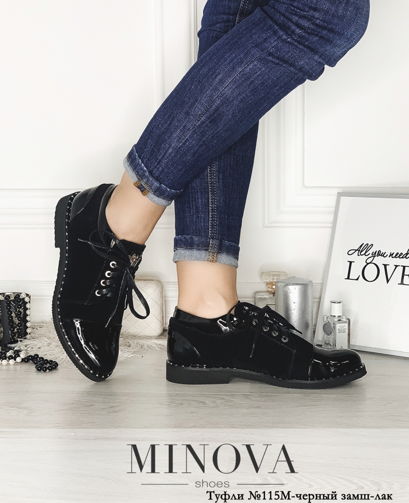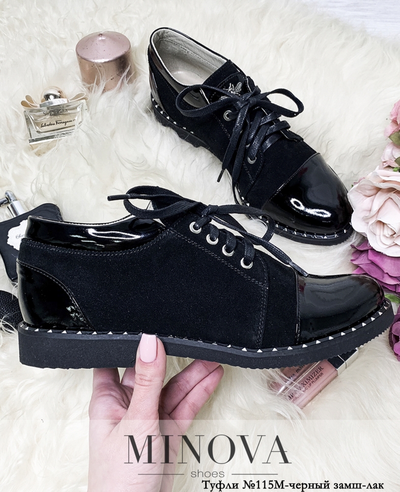 Туфли на шнурках из комбинации замши и лаковой кожи. Носок и пятка выполнены в лаке. Язычок украшен декоративной деталью. Подошва оформлена рантом.
