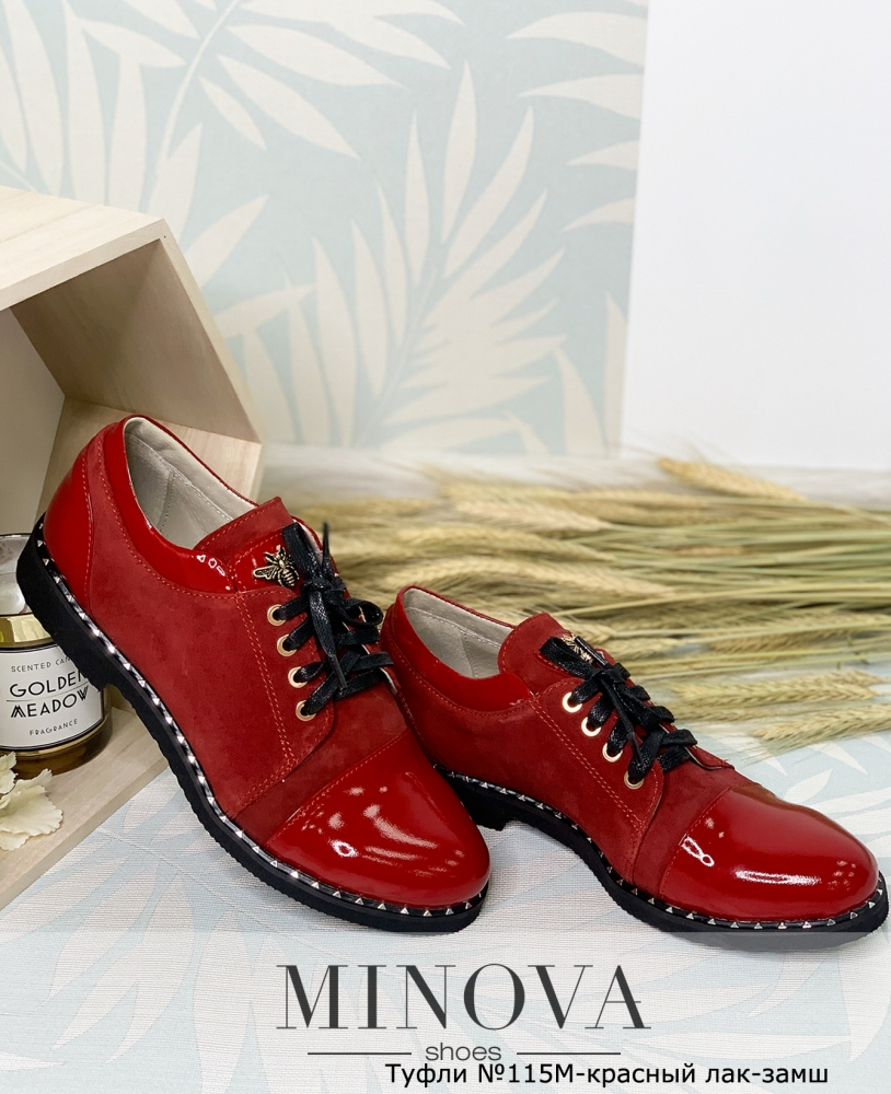 Аккуратные и стильные ботинки из новой коллекции женской обуви Minova понравятся девушкам, которые предпочитают оригинальную обувь. Ботинки из натуральной кожи, с небольшим каблучком на подошве, носок и задник лакированные, а язычок – из блестящей кожи с лакированной вставкой, украшенной металлической пчёлкой. Штаферка (по верхней части ботинка) тоже закреплена лакированной кожей. По основной части – вставка из блестящей кожи или матового замша. Шнурки широкие, люверсы – металлические. По ранту подошвы – блестящие треугольные заклёпки. Стельки мягкие, подошва прорезиненная. Такие ботинки хорошо подойдут для создания городского стиля. В каталоге вы найдёте коричневый, красный и синий лакированные варианты с замшевыми вставками, а также чёрный с серебром.