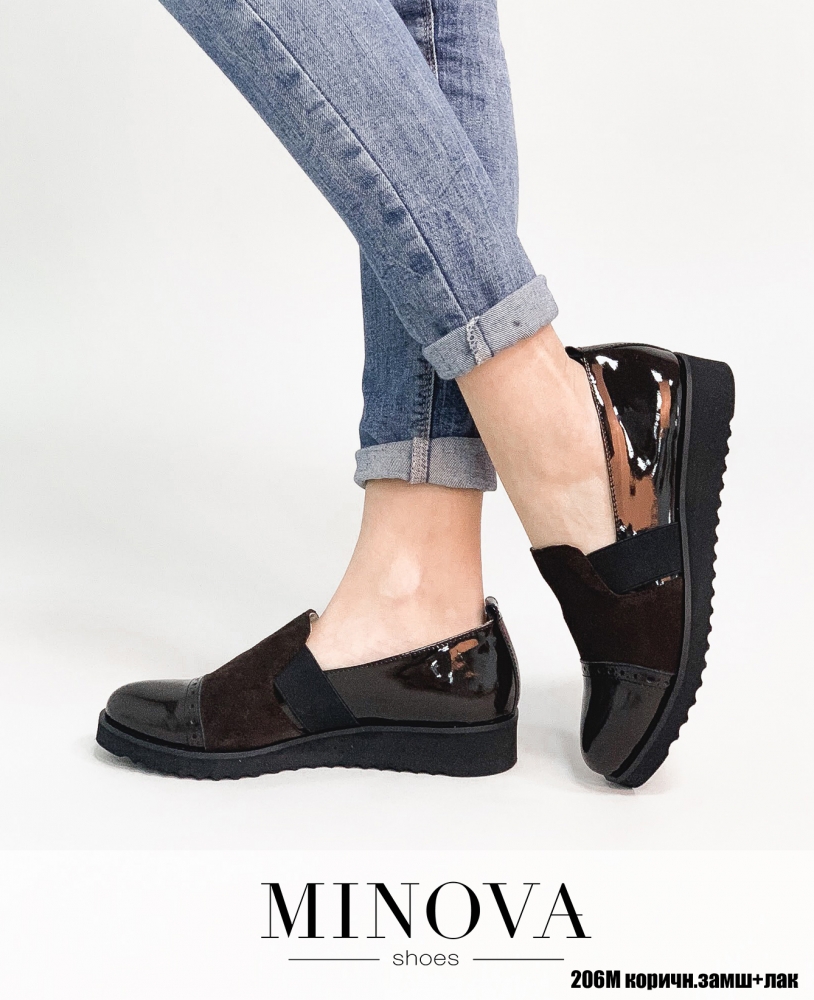Туфли из комбинации лаковой кожи и замши на утолщенной рифленой подошве. Носочек украшен брогированием. Для удобства при надевании, туфли оснащены эластичными резинками по бокам.