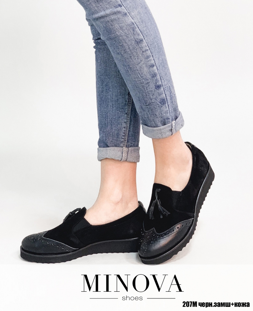 Лоферы из комбинации лаковой кожи и замши на рифленой черной подошве. Язычок украшен кисточками и дополнен резинками по бокам. Круглый носок оформлен броггированием.