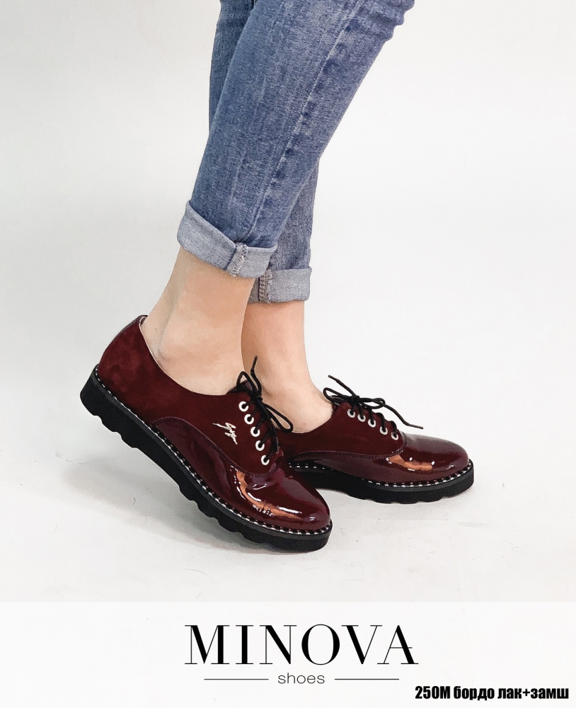 Закрытые туфли на шнурках из лаковой кожи и замши. Туфли на тракторной цельной подошве. Стык подошвы украшен блестящим рантом. Боковинка украшена золотистой металлической деталью.