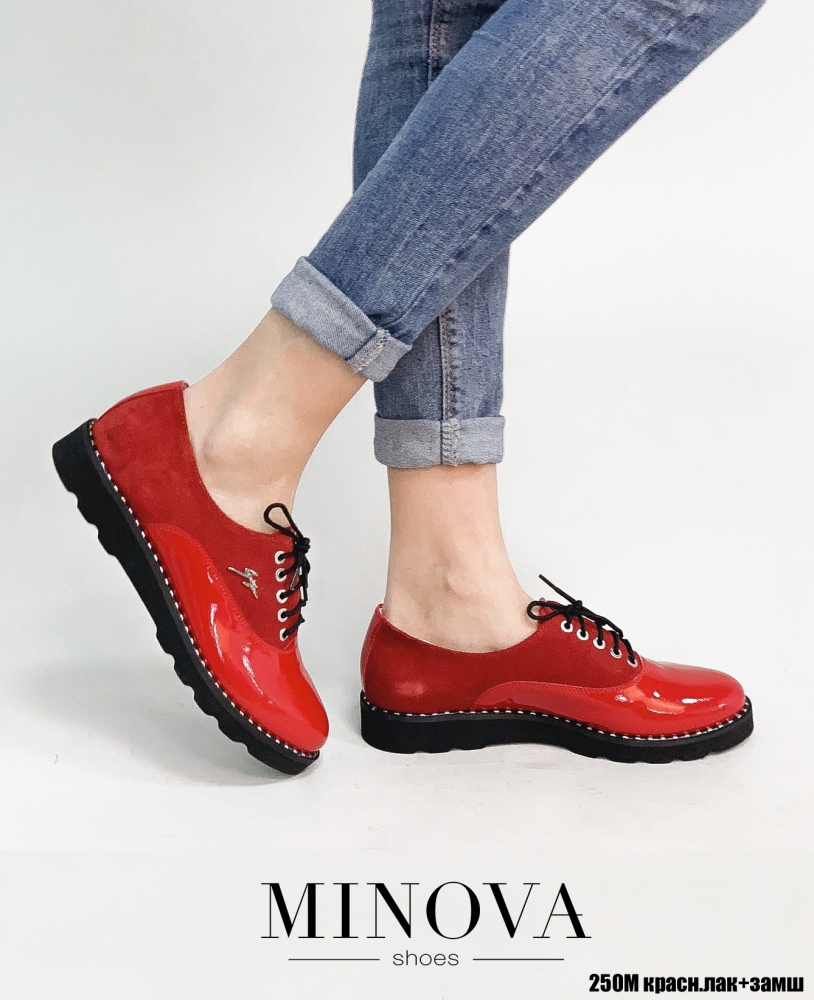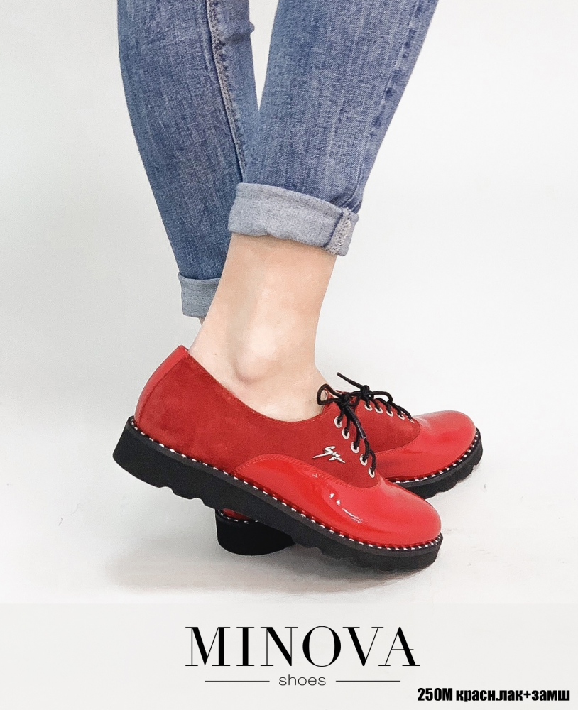 Закрытые туфли на шнурках из лаковой кожи и замши. Туфли на тракторной цельной подошве. Стык подошвы украшен блестящим рантом. Боковинка украшена золотистой металлической деталью.