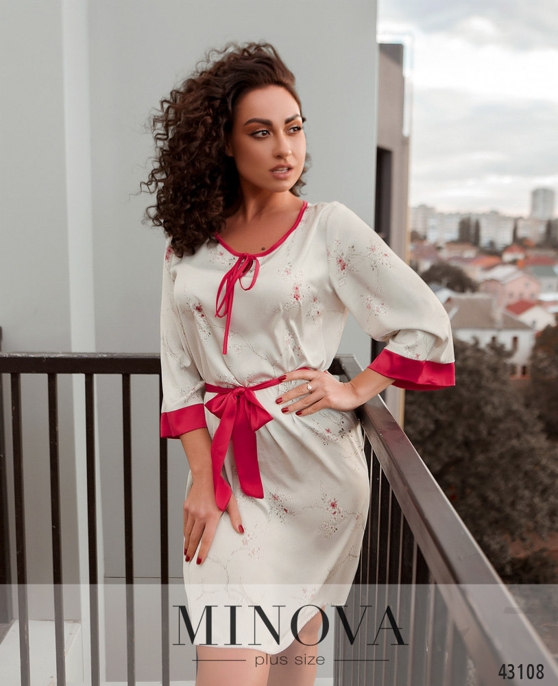 Романтичное платье батал с полукруглым вырезом горловины и лентами под вырезом. Рукава фасона "кимоно", с манжетами. В наличии врезные карманы, застёжек нет. В комплекте пояс.