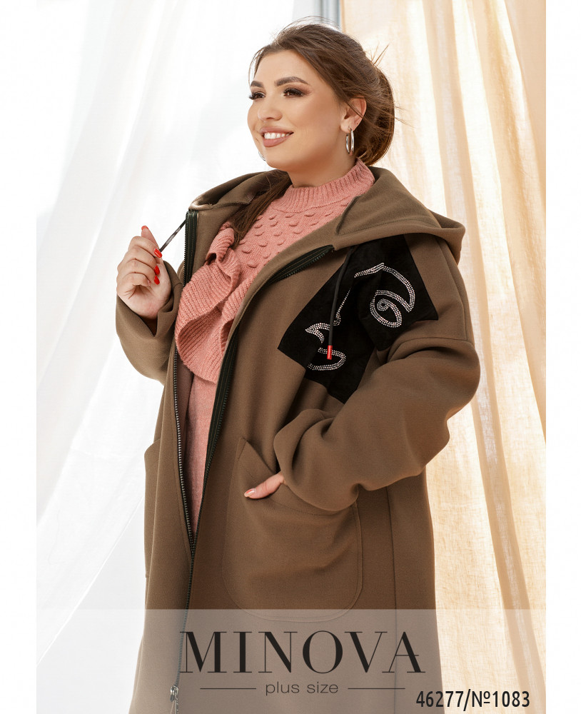 Мягкий и привлекательный повседневный длинный кардиган батал с капюшоном, через капюшон пропущен шнурок. На левой стороне груди - декоративная нашивка, украшенная узором из страз. По бокам - вместительные накладные карманы. Без подкладки.