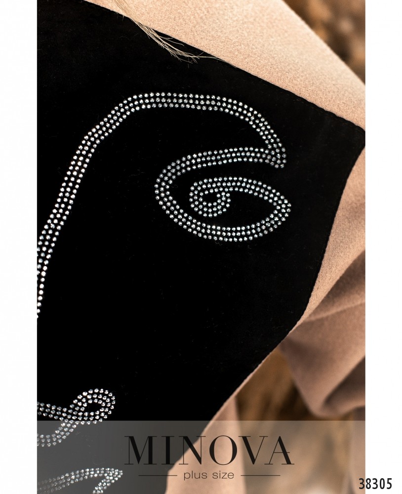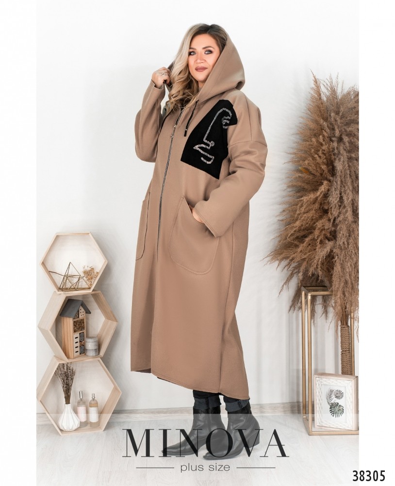 Уютный и удобный кардиган батал с капюшоном, накладными карманами по бокам и молнией по центру. На левой стороне груди – бархатная нашивка, украшенная узором из пайеток. Через капюшон пропущен шнурок. Кофта без подкладки, рукава без манжет.