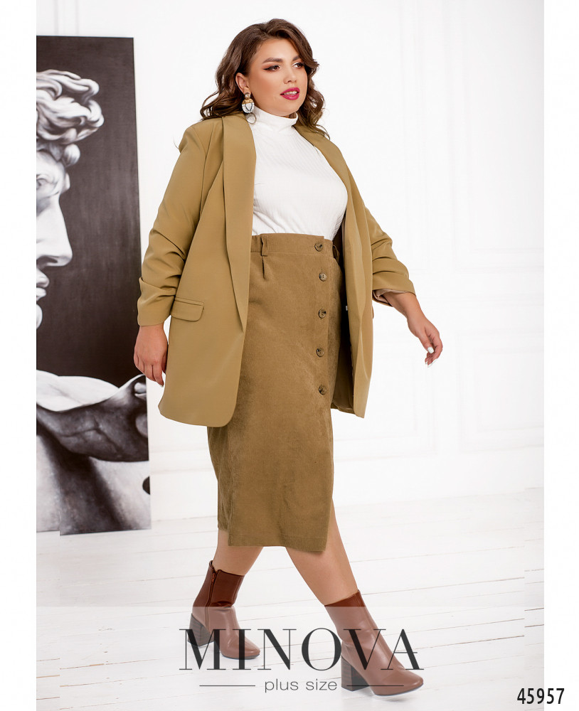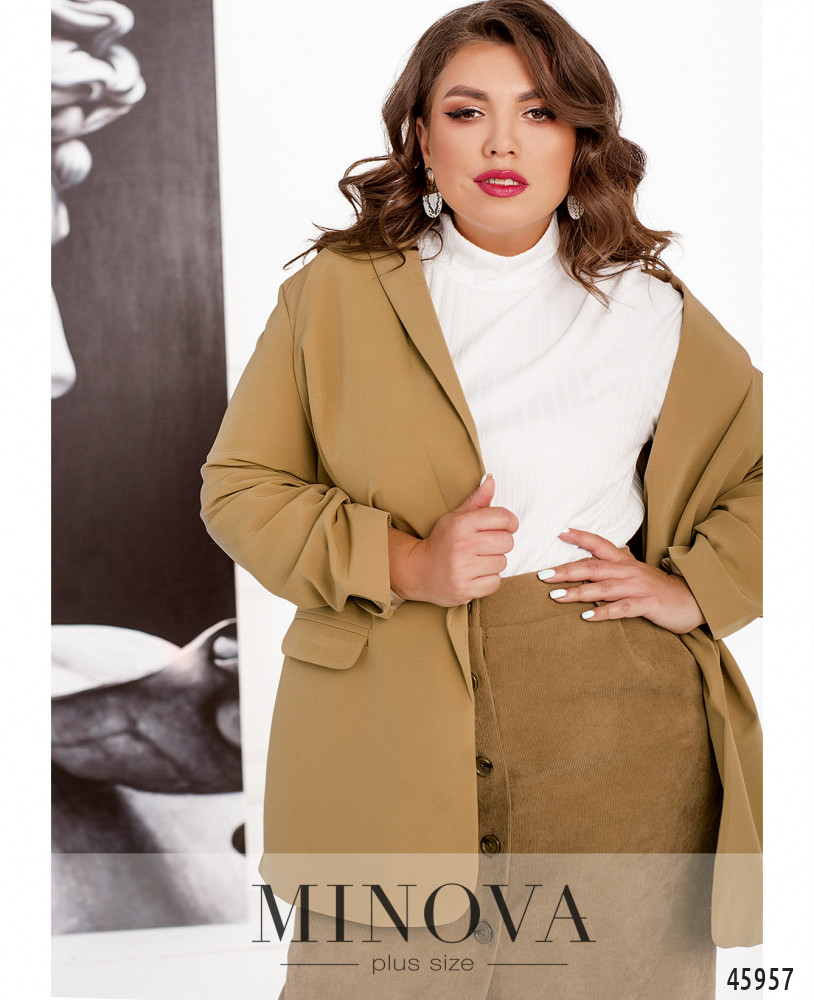 Элегантный минималистичный пиджак плюс сайз с подкладкой, с подплечниками, без застёжек. Лацканы гладкие, рукава со стильными присобранными оборками на месте манжет. Спереди - прорезные карманы.