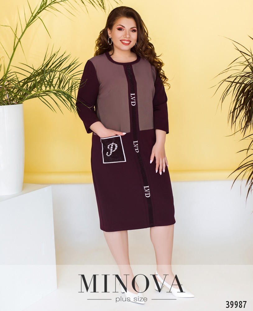 Стильное и оригинальное платье большого размера без застёжек, с полукруглым вырезом горловины. На груди вытачки, справа на бедре - накладной карман, украшенный декором из страз. Силуэт приталенный. Рукава без манжет.