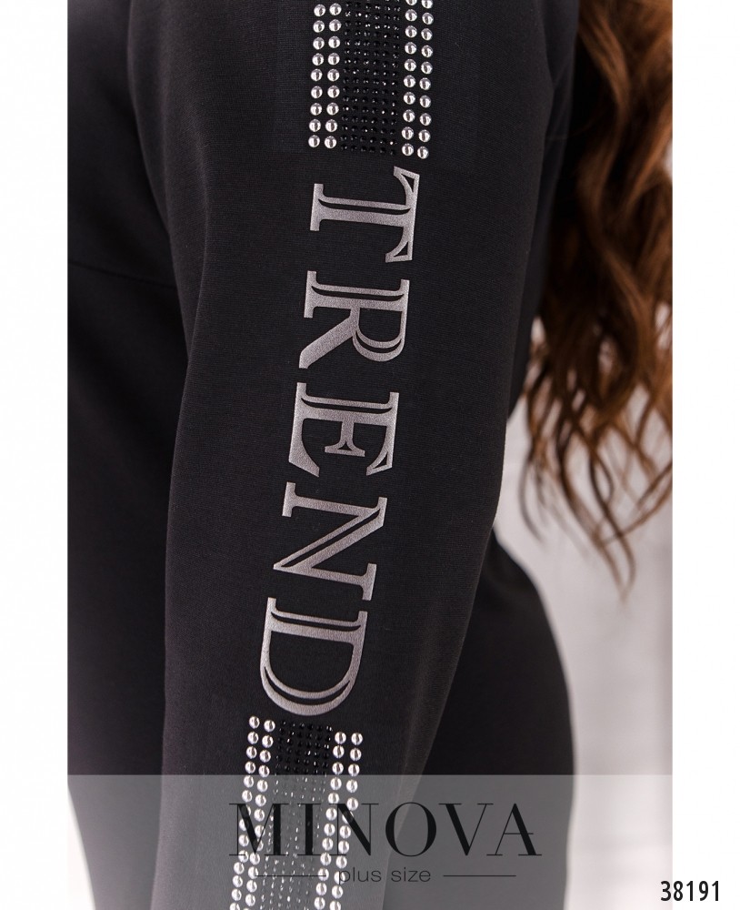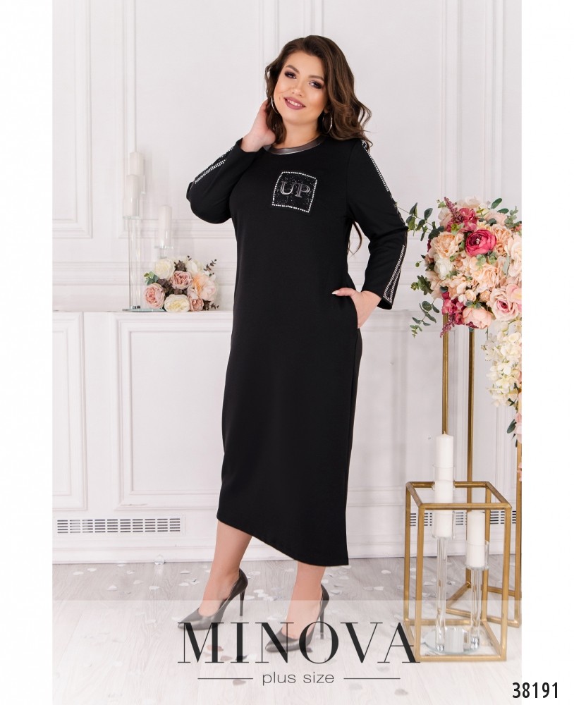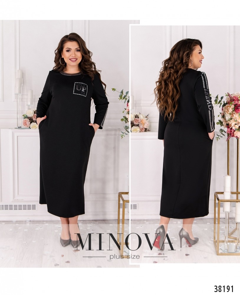 Оригинальное платье большого размера, украшено на рукавах и накладном кармане на груди стразами и декоративной нашивкой, на груди вытачки, по бокам - врезные карманы, застёжек нет. Вырез горловины оторочен контрастной лентой. Рукава без манжет.