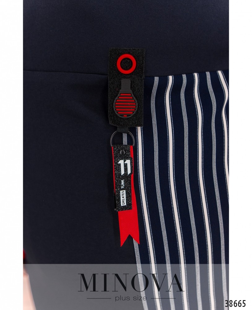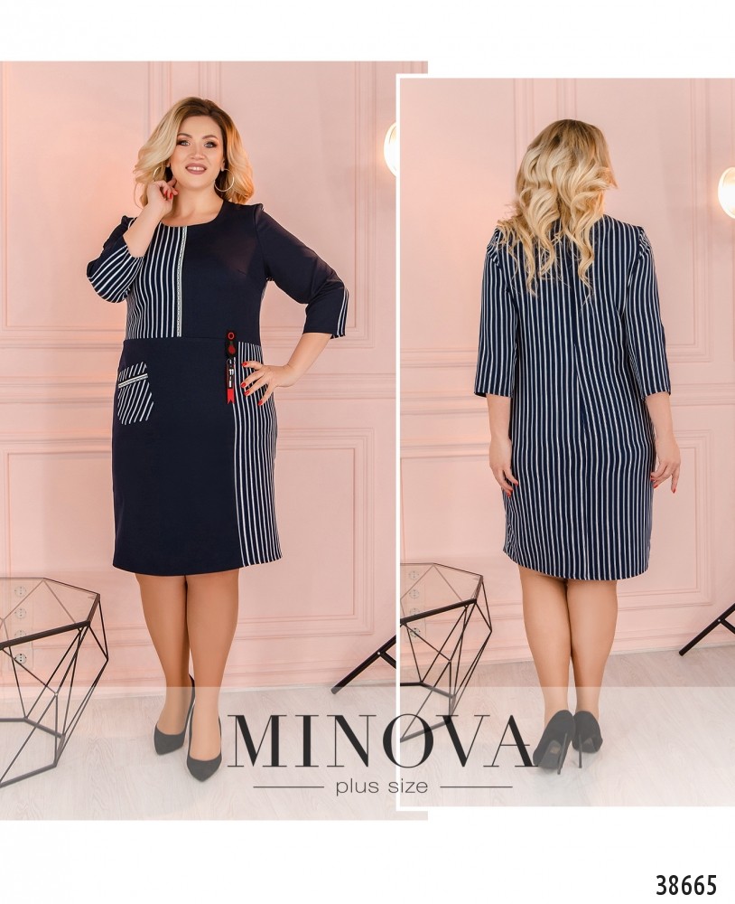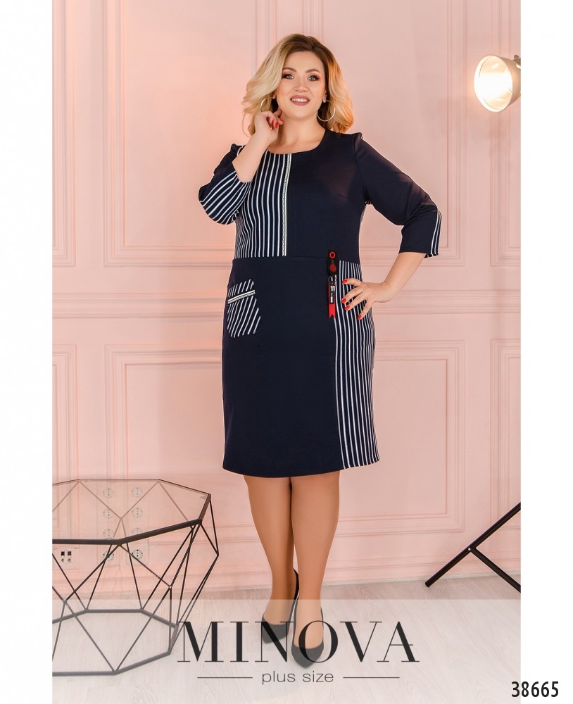 Привлекательное и яркое платье батал с накладным карманом на правом бедре и декоративной нашивкой - на левом. Застёжек нет, вырез горловины полукруглый. Рукава без манжет. Спинка - в полоску.