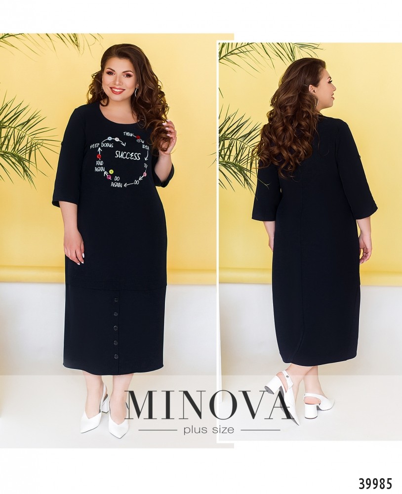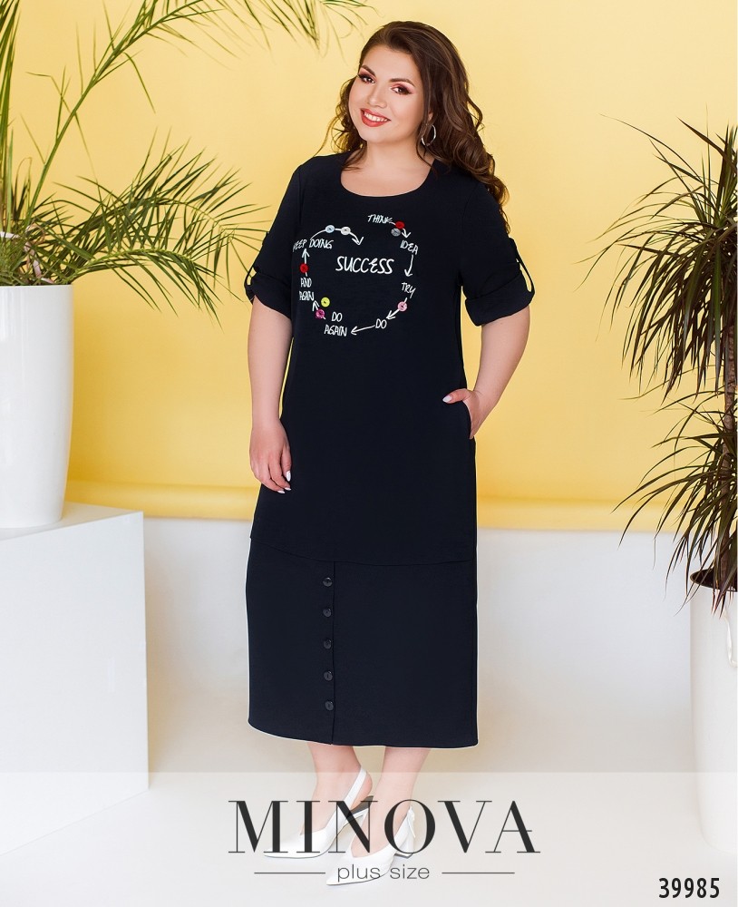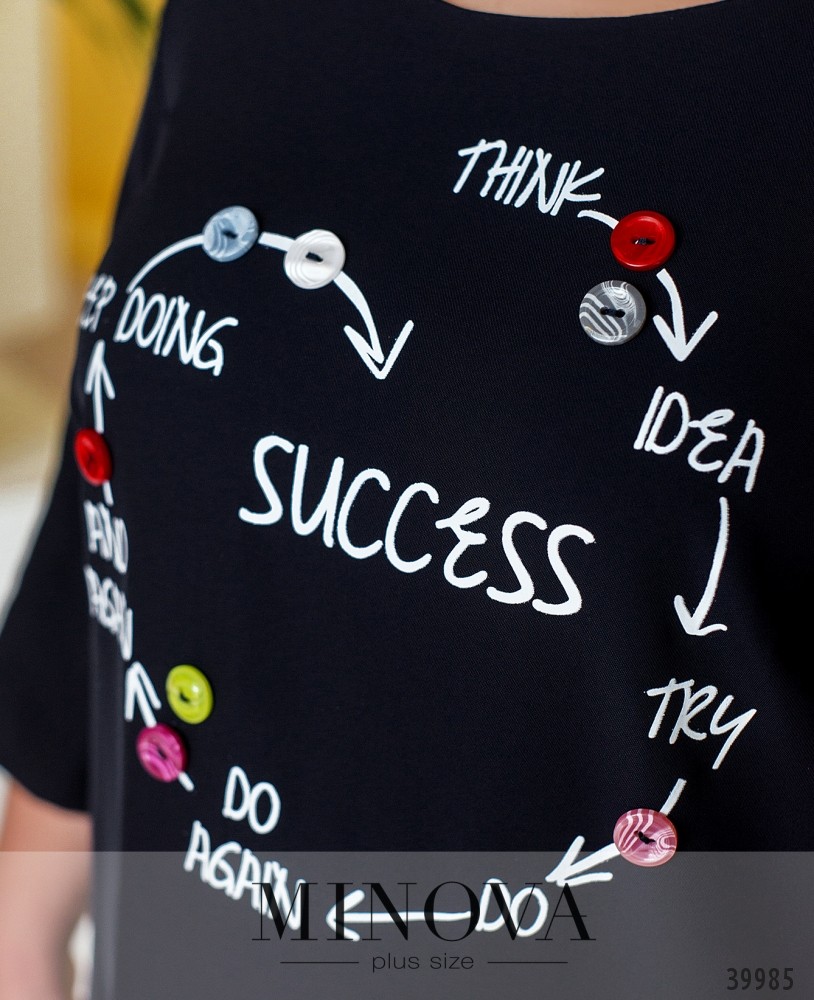 Актуальное платье плюс сайз с оригинальным принтом и декоративными пуговицами на груди и на подоле. Рукава-трансформеры регулируются на пуговицу и ленту, на ленте две прорези для пуговицы. По бокам - врезные карманы, на груди вытачки. Застёжек нет, вырез горловины полукруглый.