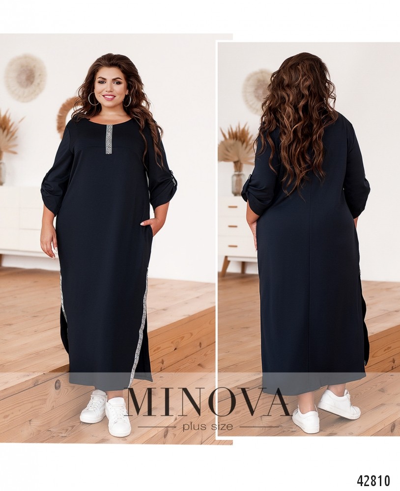 Яркое платье батал без застёжек, со врезными карманами по бокам. На рукавах - регулировочные декоративные ленты, подшитые на пуговицу. На груди от горловины и на подоле по бокам - декоративные ленты, а также на подоле разрезы по бокам. Вырез горловины полукруглый. Подол подшит к лифу.