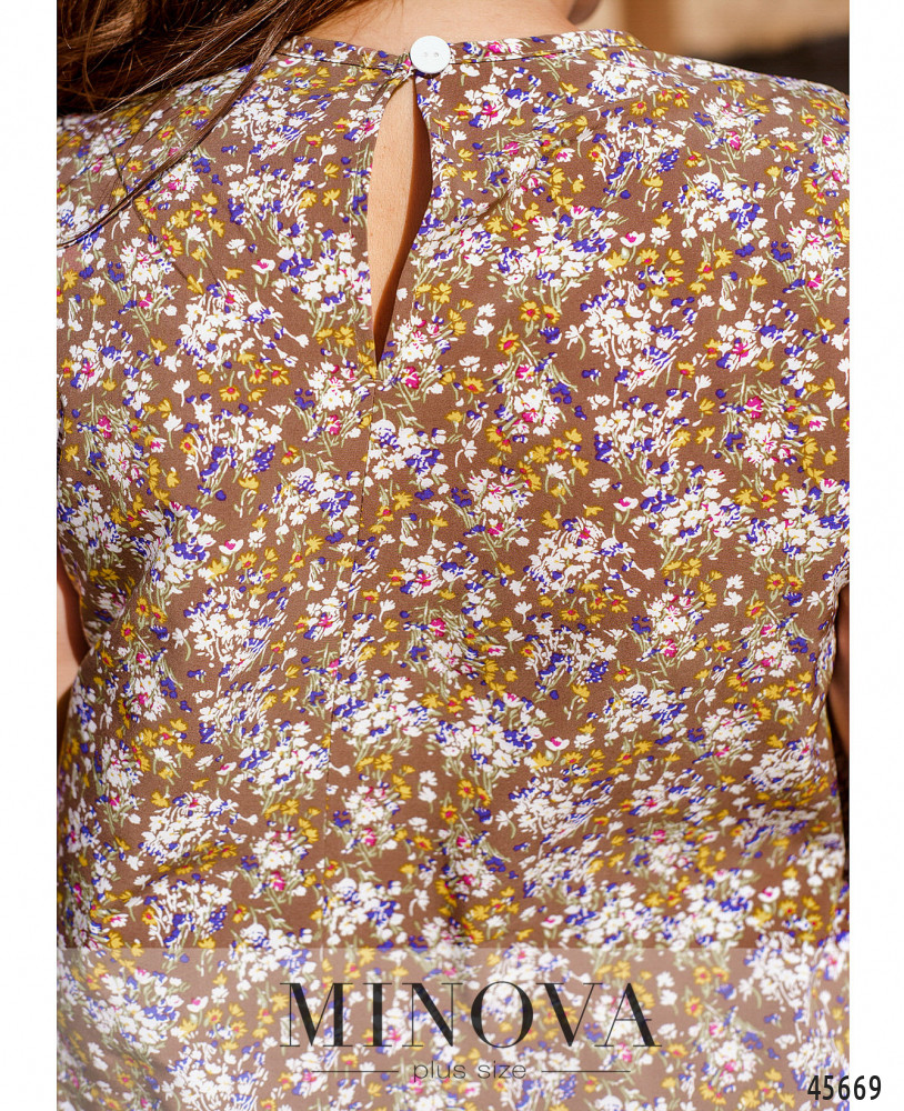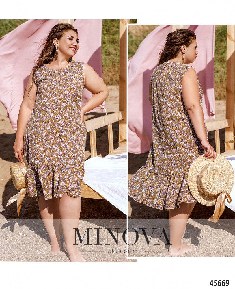 Стильное платье плюс сайз с полукруглым вырезом горловины, застёжка - пуговка сзади под шеей, без рукавов, на груди вытачки, на подоле оборки. Без карманов. Пояс НЕ входит в комплект.