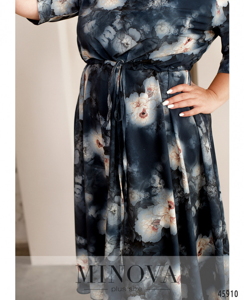 Стильное платье большого размера с коротким рукавом, без застёжек и карманов, с широким полукруглым вырезом горловины. Через талию пропущен шнурок под кулиской, подол ниспадает мягкими оборками.