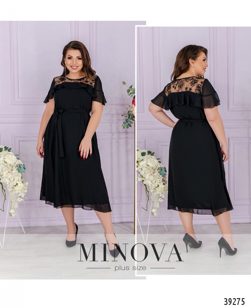 Привлекательное платье батал А-силуэта, без застёжек и карманов, с подкладкой. Верх по спинке и спереди украшен тонкой сеточкой с вышивкой, а также мягкими оборками, выполняющими роль рукавов. В комплекте прилагается пояс в тон.