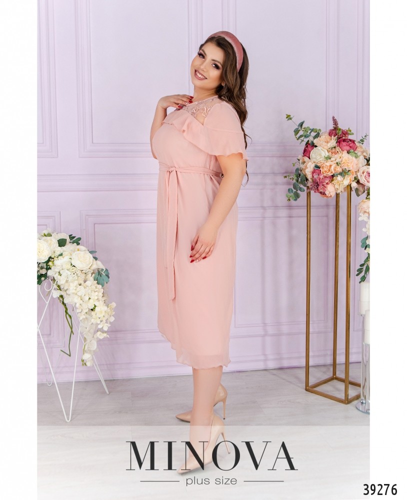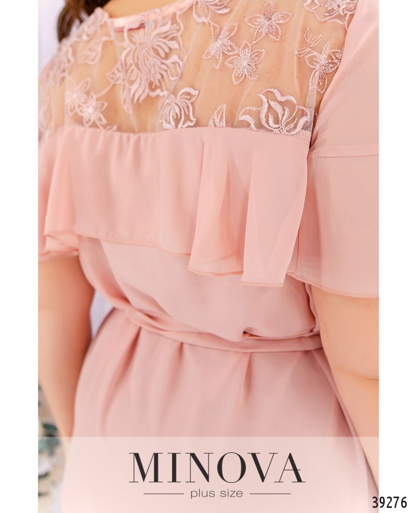 Привлекательное платье батал А-силуэта, без застёжек и карманов, с подкладкой. Верх по спинке и спереди украшен тонкой сеточкой с вышивкой, а также мягкими оборками, выполняющими роль рукавов. В комплекте прилагается пояс в тон.