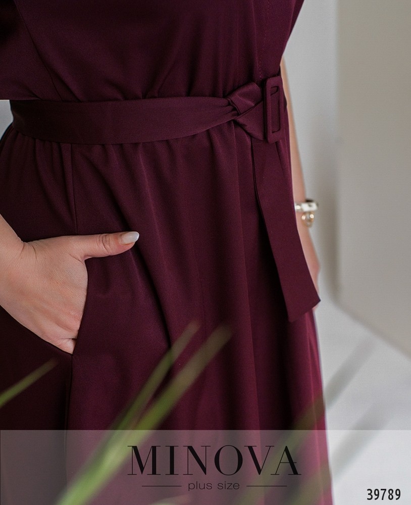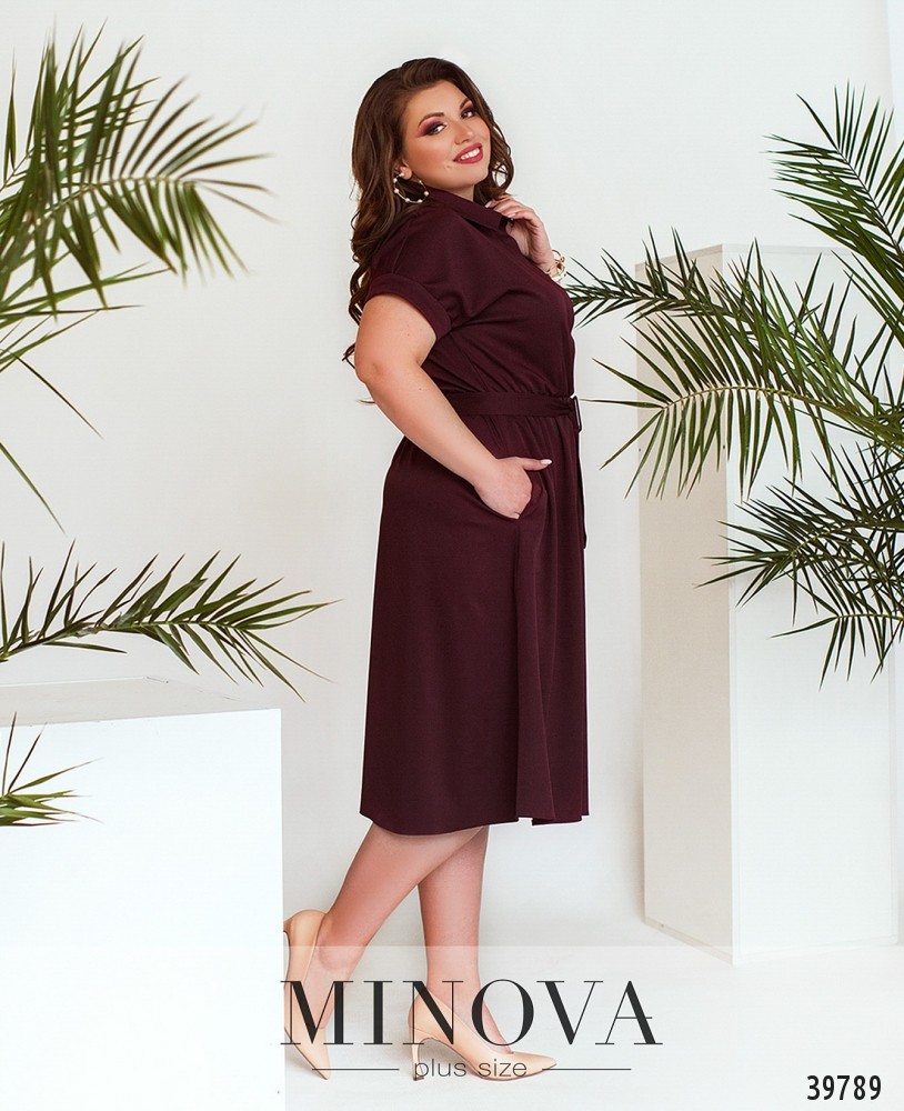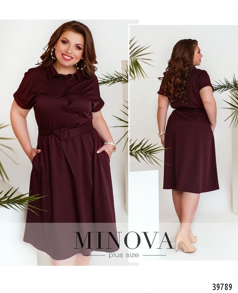Нежное платье большого размера с отложным воротничком и рядом пуговиц спереди - наверху две золотистые, и ряд прозрачных, прикрытых планкой, незаметных. В комплекте - пояс с прямоугольной пряжкой. По бокам - врезные карманы. В пояс вшита резинка.