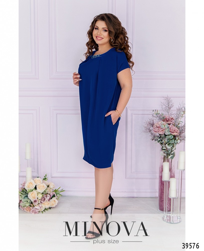 Нарядное и оригинальное платье плюс сайз с иллюзией подшитой накидки. Вырез горловины полукруглый, под ним - декор с камнями, ткань присобрана сверху и снизу. рукава очень короткие, без манжет. По бокам - врезные карманы, застёжек нет.
