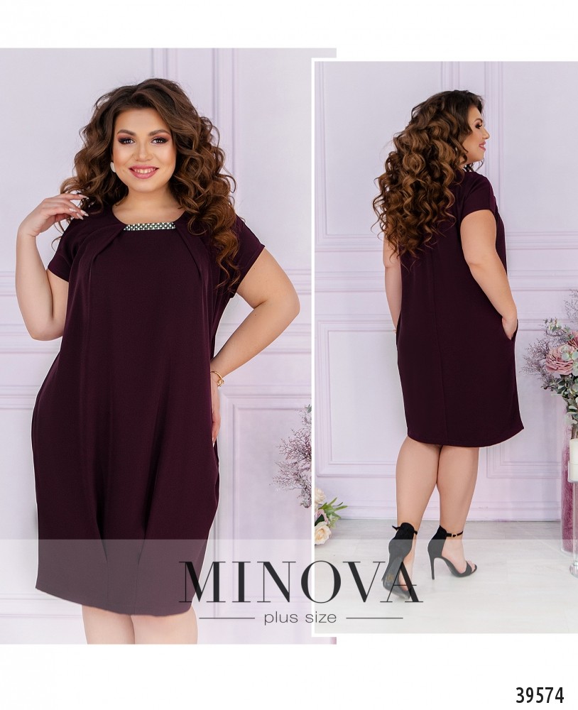Нарядное и оригинальное платье плюс сайз с иллюзией подшитой накидки. Вырез горловины полукруглый, под ним - декор с камнями, ткань присобрана сверху и снизу. рукава очень короткие, без манжет. По бокам - врезные карманы, застёжек нет.