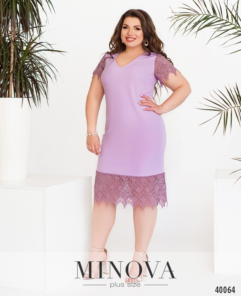 Нарядное коктейльное платье батал с ажурным кружевом на подоле и на рукавах. Вырез горловины V-образный, неглубокий, карманов и застёжек нет. Силуэт приталенный, на груди вытачки.