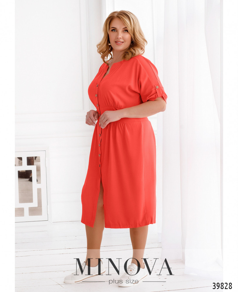 Привлекательное минималистичное платье батал с рядом пуговиц спереди на планке и подчёркнутой талией. Рукава фасона реглан - с подшитой лентой регулировки. Ткань присобрана спереди и по спинке на уровне пояса. Карманов нет.