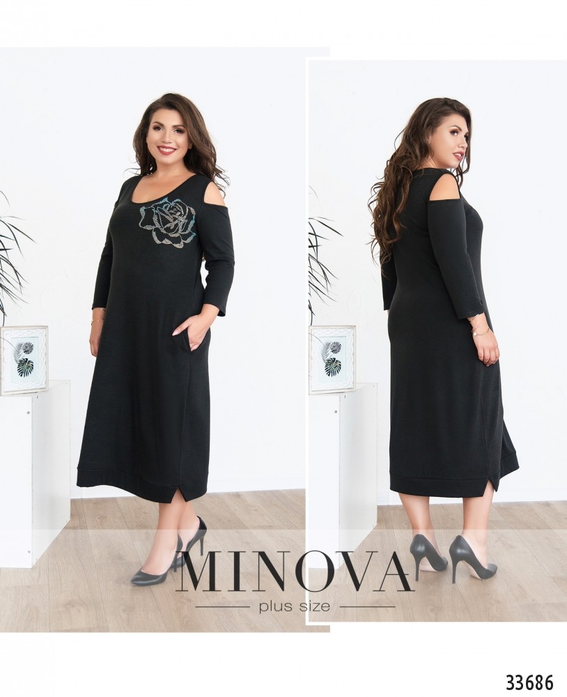 Один декоративный элемент – и даже самое простое платье преображается. Дизайнеры от Minova умеют правильно расставлять акценты. Представленное в новой коллекции платье с глубоким U-образным вырезом горловины выполнено из мягкой, очень приятной и нежной ткани. Застёжки отсутствуют. На левой стороне груди – крупная, тщательно «прорисованная» роза из мелких блестящих страз. Ещё один нюанс – рукава. Плечи остаются слегка приоткрытыми, а ниже рукава длиной ¾. Так что спереди выглядит, будто платье на бретелях, но спинка закрыта полностью. Подол с подшитым манжетом, по бокам разрезы. В наличии врезные карманы по бокам. Такое платье пригодится для создания более нарядного повседневного образа.