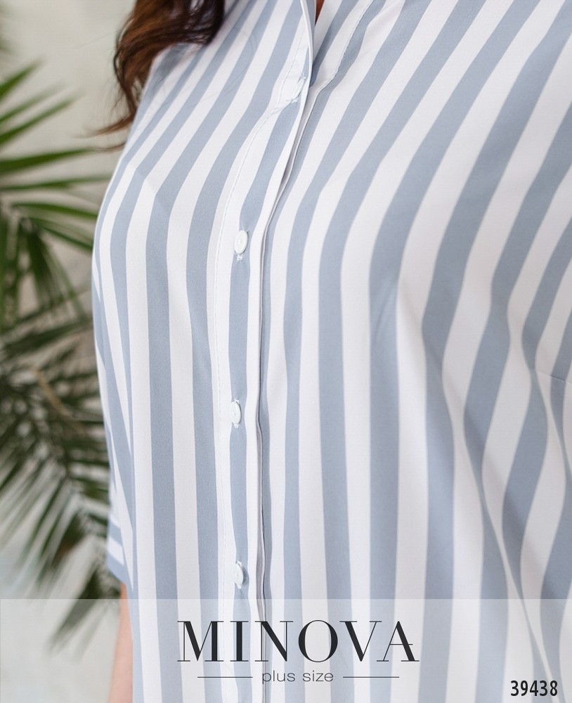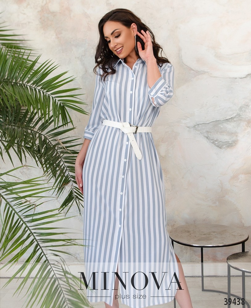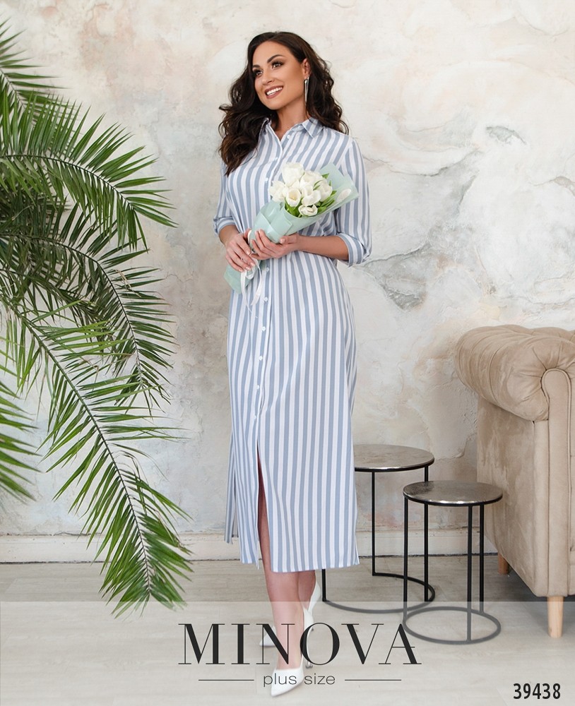 Минималистичное платье макси большого размера, с отложным воротничком, без карманов. Застёгивается на полный ряд пуговиц спереди на планке. На рукавах небольшие манжеты с одной пуговицей. На груди вытачки.