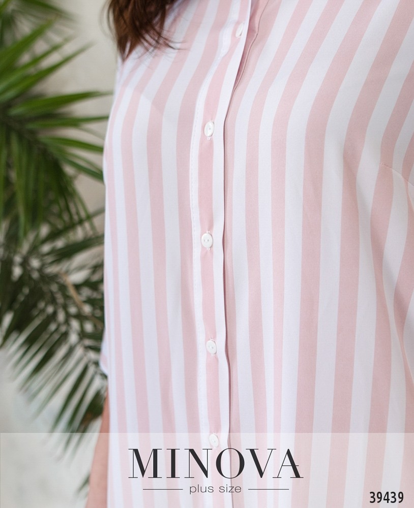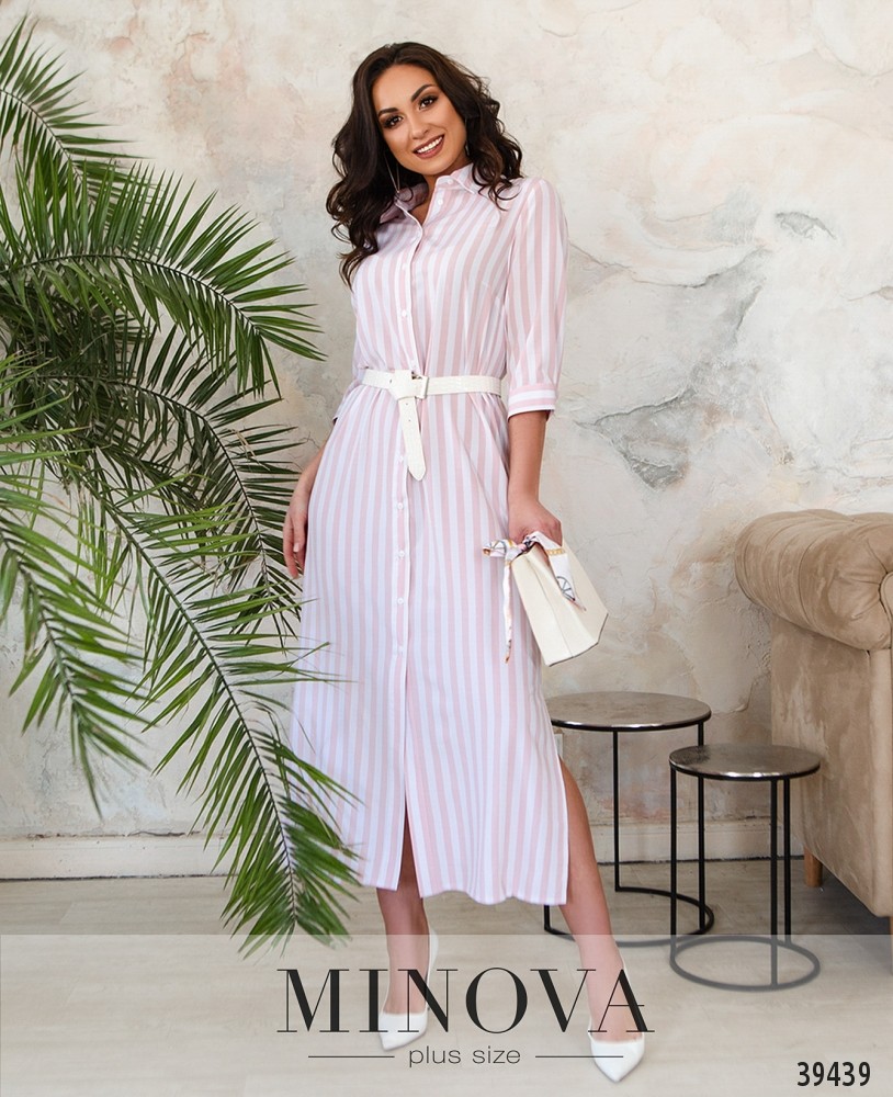 Минималистичное платье макси большого размера, с отложным воротничком, без карманов. Застёгивается на полный ряд пуговиц спереди на планке. На рукавах небольшие манжеты с одной пуговицей. На груди вытачки.