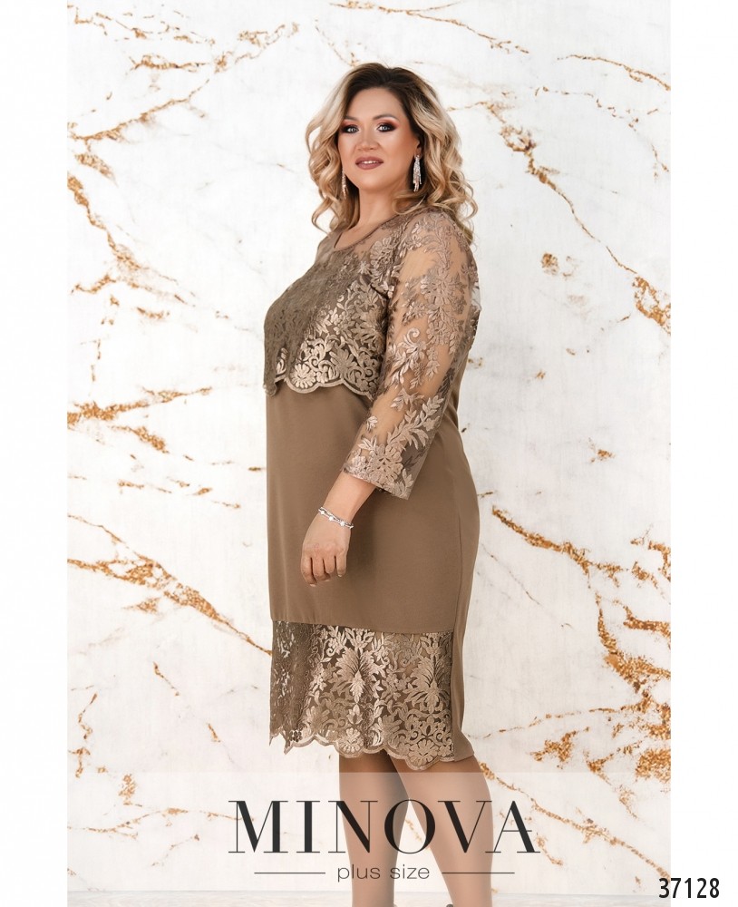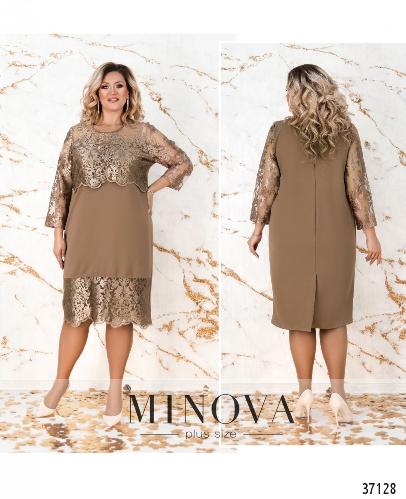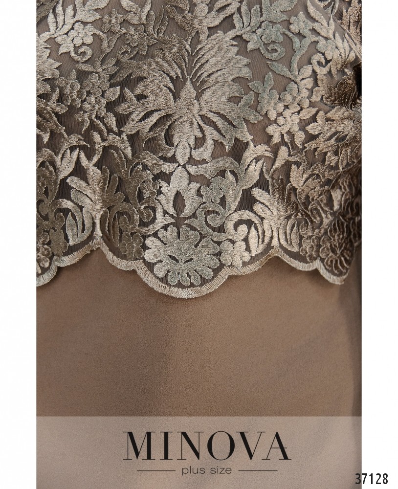 Ажурное блестящее кружево расположено на представленной модели платья батал на подоле спереди и сверху, в виде накидки. Minova предлагает в новом каталоге нарядное платье прямого кроя из мягкой, приятной ткани. Платье без застёжек и карманов, с небольшими вытачками на груди. Рукава полностью из кружева, без подкладок. На лифе кружево с подкладкой, прикрывающей грудь, а плечи - полупрозрачные. Спинка полностью закрыта, снизу сзади – небольшая шлица. Выберите пастельный или глубокий оттенок красного, синего или чёрного, и дополните образ удачно выбранной обувью.