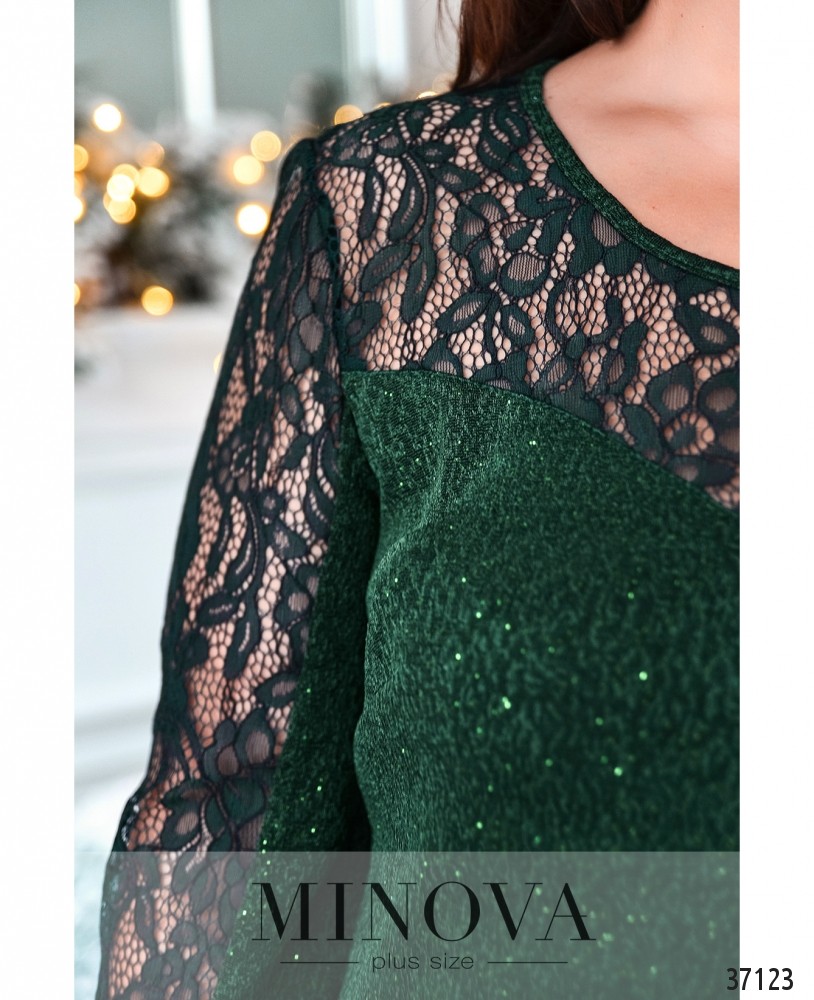 Стильное и нарядное платье батал из свежего каталога женской одежды плюс сайз от Minova отлично впишется в ваш праздничный или даже повседневный гардероб. Платье двуслойное, с мягкой подкладкой снизу и ажурным кружевом сверху. Рукава без манжет и без подкладки. Вырез горловины неглубокий, в виде фигурного каре. Застёжек и карманов на платье нет, сзади на подоле – небольшая шлица. Вы можете дополнить образ обувью на каблуке, и яркими однотонными украшениями. В каталоге представлены пастельные и тёмные оттенки, так что вы можете выбрать самый подходящий именно для вас!