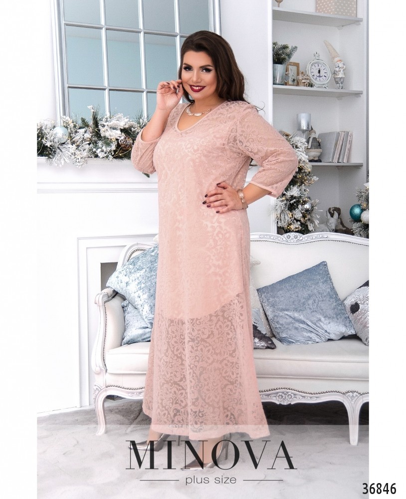 Нежное и нарядное двойное платье батал из новой коллекции Minova позволит вам создать нарядный и очаровательный образ. Платье состоит из двух частей. Нижнее – на тонких лямках, с вытачками на груди, без карманов и застёжек, приталенное, длиной выше колена. Вырез горловины в виде фигурного каре. Верхняя накидка выполнена из сеточки с бархатным гипюром, вырез горловины V-образный. Накидка цельная, без застёжек и карманов, длины миди, с рукавами длиной ¾ без манжет. Накидка А-силуэта. В целом наряд производит очень приятное впечатление, вы можете выбрать пастельный или глубокий оттенок и дополнить образ украшениями и подходящей обувью.