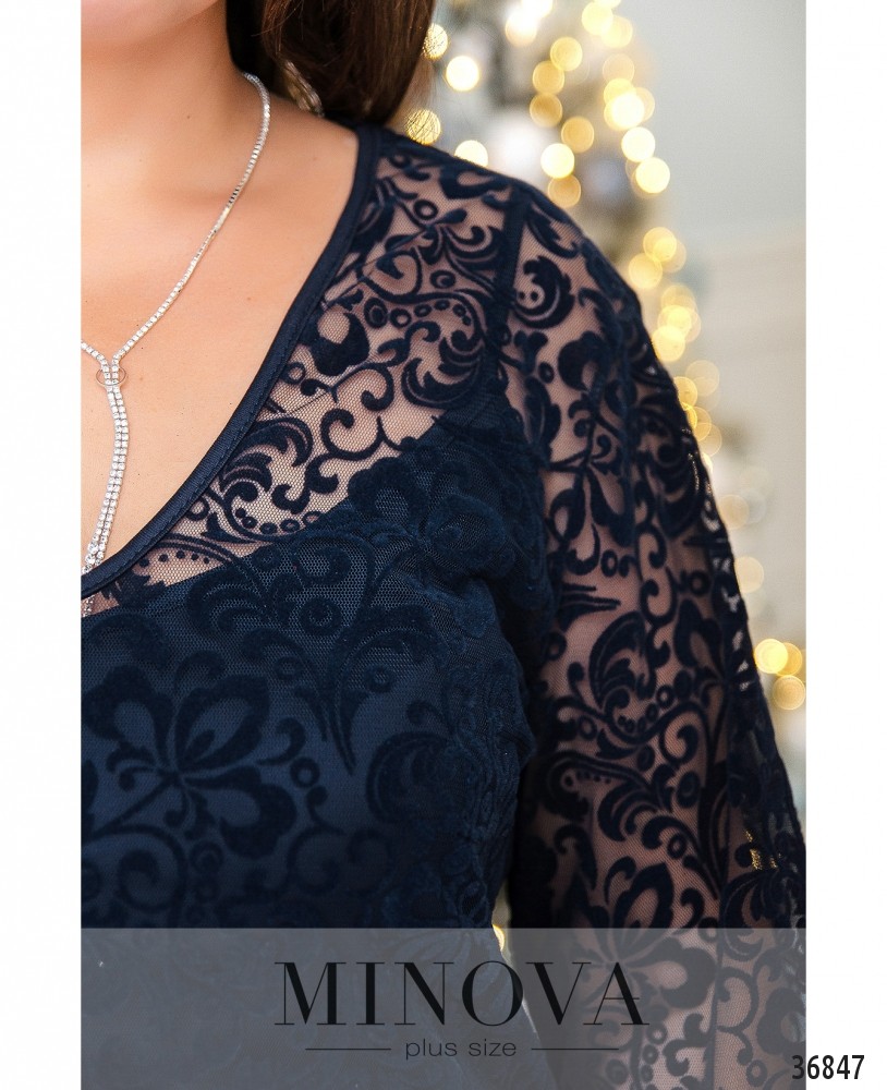 Нежное и нарядное двойное платье батал из новой коллекции Minova позволит вам создать нарядный и очаровательный образ. Платье состоит из двух частей. Нижнее – на тонких лямках, с вытачками на груди, без карманов и застёжек, приталенное, длиной выше колена. Вырез горловины в виде фигурного каре. Верхняя накидка выполнена из сеточки с бархатным гипюром, вырез горловины V-образный. Накидка цельная, без застёжек и карманов, длины миди, с рукавами длиной ¾ без манжет. Накидка А-силуэта. В целом наряд производит очень приятное впечатление, вы можете выбрать пастельный или глубокий оттенок и дополнить образ украшениями и подходящей обувью.