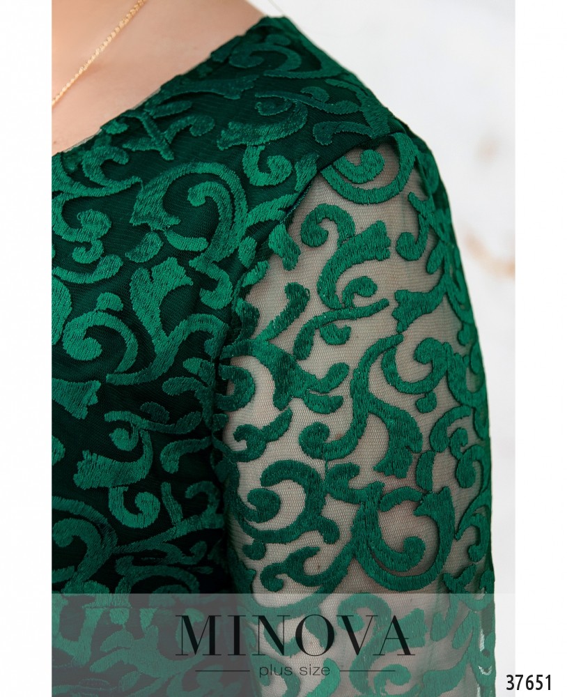 Роскошное вечернее платье батал без застёжек и карманов, прямого кроя. Снизу мягкая подкладка, сверху – элегантный гипюр. Рукава без манжет и без подкладки. Вырез горловины широкий, V-образный. В комплекте прилагается подвеска.
