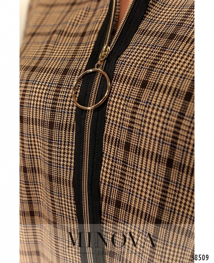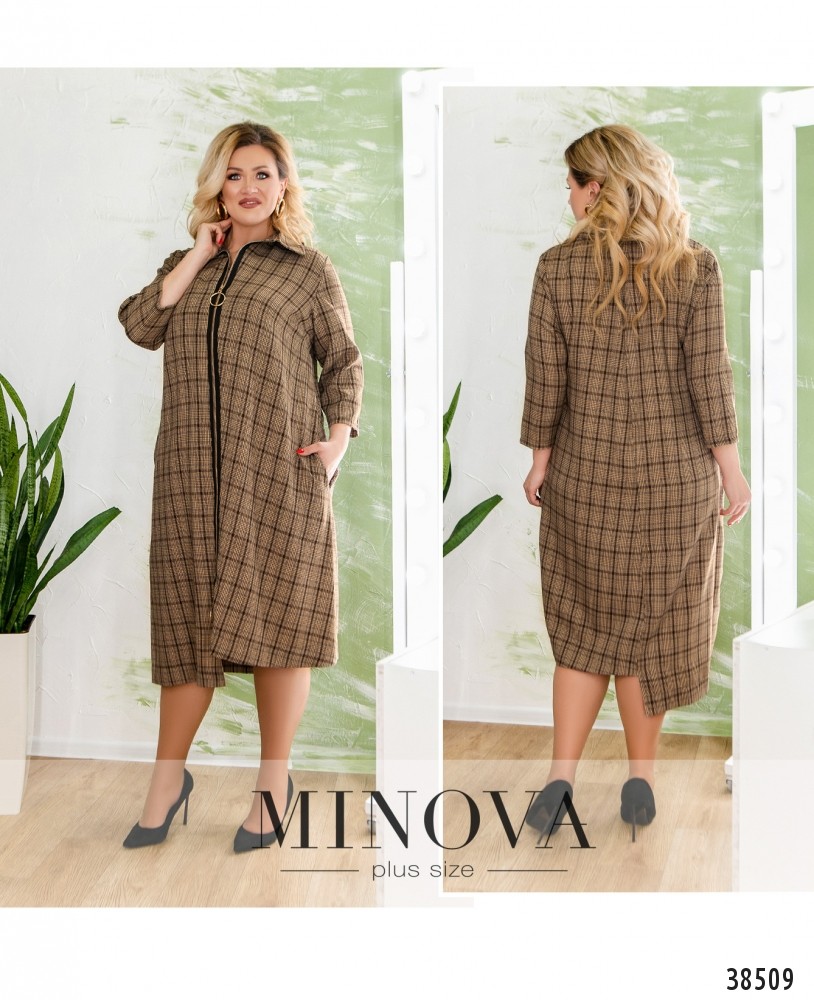 Яркое и нарядное платье батал с застёжкой-молнией по центру, на молнии - два крупных круглых бегунка. По бокам - врезные карманы, рукава без манжет, воротничок отложной.