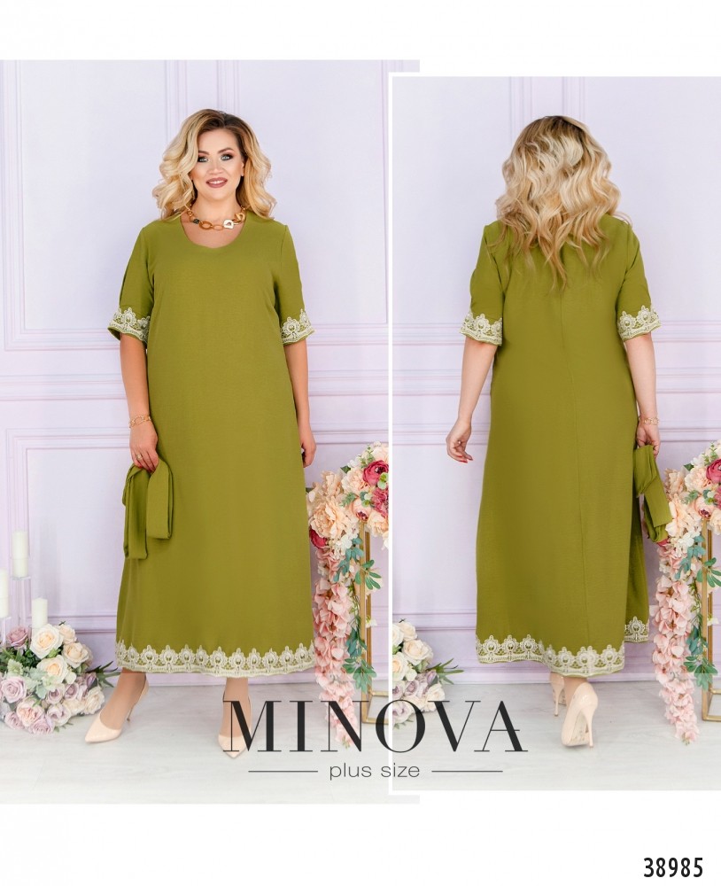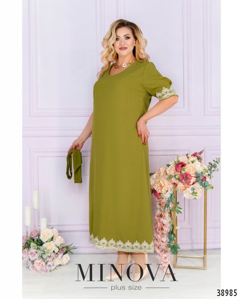 Нежное минималистичное платье батал, украшенное кружевом на подоле и на рукавах. Вырез декольте глубокий, V-образный, на груди - вытачки, без застёжек и карманов.
